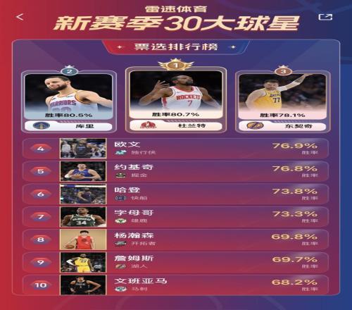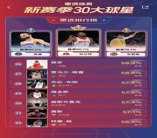 雷速NBA新赛季30大球星即时排名:杨瀚森力压詹姆斯列第八