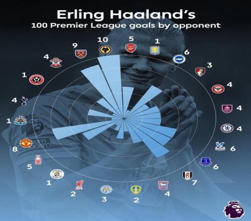 对手方面,哈兰德堪称“狼队克星”,6次交锋打入10球,仅用21次射门,平均每射门预期进球高达0.57。此外,他对西汉姆联(9球)、曼联(8球)和富勒姆(7球)也屡有斩获。效率最高的对手是伊普斯维奇,上赛季两场攻入4球。目前他对阵过的所有英超球队均有进球,仅对纽卡、维拉、卢顿和谢菲联四队各入1球。