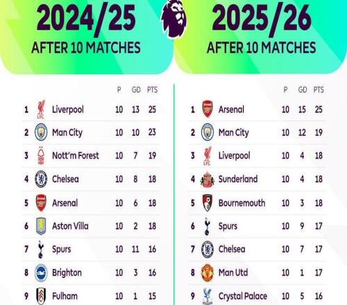 英超前10轮与上赛季同期积分对比:阿森纳、利物浦积分互换 -