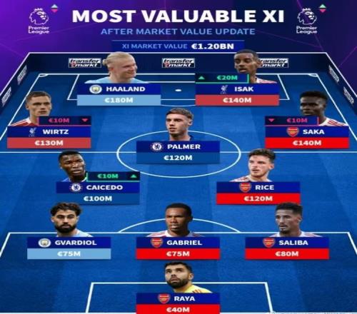 德转列身价更新后英超最贵阵:哈兰德领衔,总身价达12亿欧 -