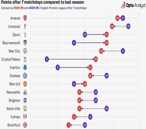 英超球队与上赛季同期积分对比:阿森纳少拿1分,利物浦少3分 -